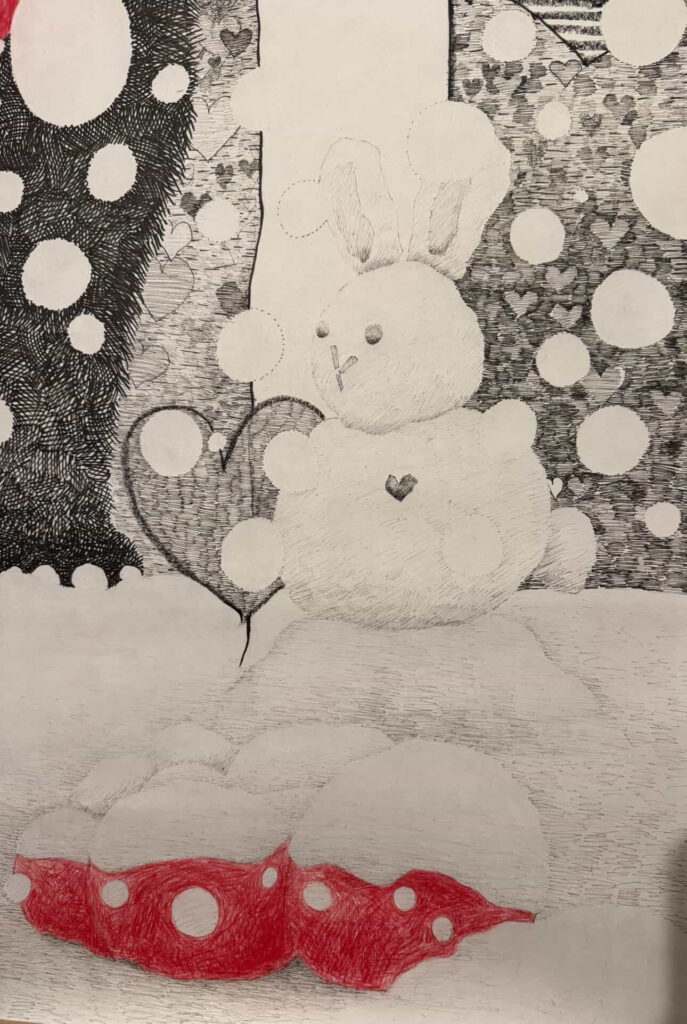 面白いことに、制作中にはまだ雪が降っておらず、彼女は「せめて想像の中だけでも」と軽井沢の雪景色を描き進めていました。ところが、作品が完成した翌週、軽井沢に本物の雪が降ったのです。 「自分の目で確かめた雪の森は、すでに絵の中に溶け込んでいました」 ガウンさんの瑞々しい感性が、軽井沢の自然と深く共鳴した瞬間でした。