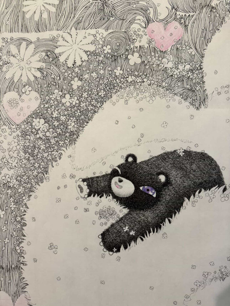 都心で活動するガウンさんが、軽井沢の冬の森と向き合って描き出した一作目。 タイトルは『雪を眺めるクマと椿ー冬の森を想う』。